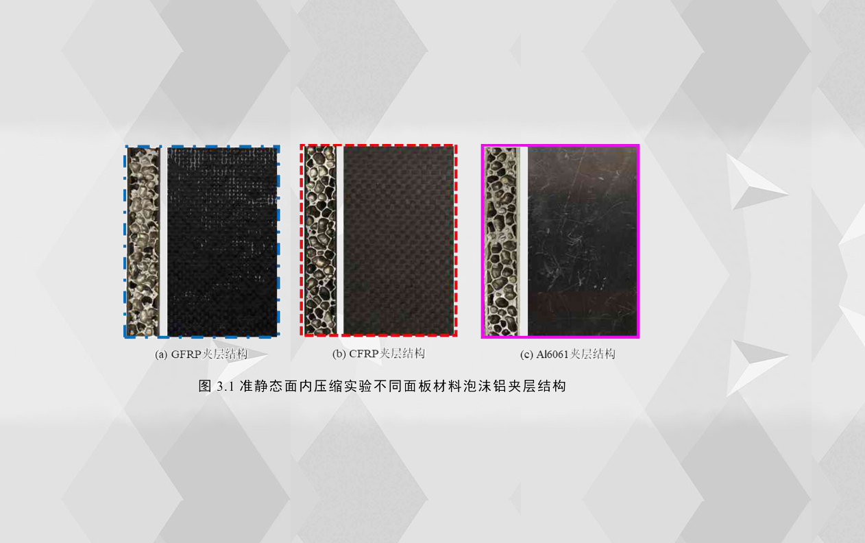 泡沫鋁夾層結(jié)構(gòu)在汽車應用中所承載的另一種典型工況為面內(nèi)壓縮,例如泡沫鋁填充引擎蓋、側(cè)門等,例如泡沫鋁填充的前縱梁,當汽車發(fā)生正面碰撞交通事故時,當沖擊速度較大時,引擎蓋、側(cè)門會發(fā)生較大的擠壓面內(nèi)變形,而夾層結(jié)構(gòu)在面內(nèi)壓縮工況下的失效機理和吸能特性也是相當復雜的,為了推動夾層結(jié)構(gòu)在汽車上的應用,對泡沫鋁夾層結(jié)構(gòu)在面內(nèi)壓縮工況下全面系統(tǒng)的研究是很有必要的。本章主要通過實驗的方法,揭示了不同配置的泡沫鋁夾層結(jié)構(gòu)在準靜態(tài)面內(nèi)壓縮工況下的結(jié)構(gòu)響應機理、失效模式以及耐撞性能,得出何種配置的泡沫鋁夾層結(jié)構(gòu)的耐撞性能更優(yōu),泡沫鋁夾層結(jié)構(gòu)的配置參數(shù)主要包括面板材料、面板厚度、芯層高度和芯層密度。