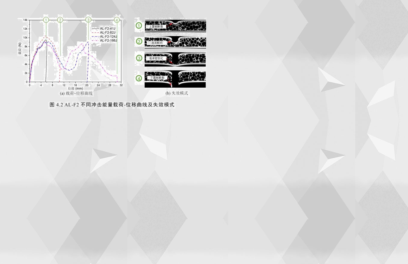 圖4.2為AL-F2在不同沖擊能量下的載荷-位移曲線及失效模式,AL-F2在166J沖擊能下試件完全穿透,其載荷-位移曲線有兩個峰值載荷,結合其在不同沖擊能量下最終損傷CT掃描圖,如圖4.2(b)所示,可以將結構響應分為三個階段,第一階段為沖頭接觸到上面板到抵達第一次峰值載荷,由于這個過程半球狀沖頭與面板的接觸面積不是線性增長且面板逐漸發(fā)生塑性變形,所以此階段的載荷呈非線性增長,當上面板出現(xiàn)裂紋時,如圖4.2(b)中①,載荷到達第一個峰值載荷;第二階段為第一次峰值載荷到第二次峰值載荷,在此階段的前半階段載荷持續(xù)下降到波谷,主要的失效模式為上面板裂紋的出現(xiàn)以及擴展,與此同時,泡沫芯層受到一定程度的壓潰,在第二階段的后半階段,由于泡沫鋁芯層被壓實至密實化,如圖4.2(b)中③所示,載荷再一次持續(xù)上升;第三階段即為第二次峰值載荷之后,開始于下面板出現(xiàn)裂紋到結構完全失去承載能力。