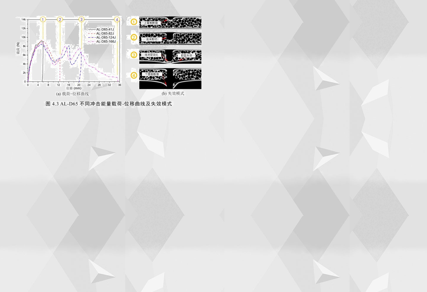 從圖4.3中AL-D65在166J沖擊能量下的載荷-位移曲線可以看出,其曲線有三個峰值載荷,結(jié)合各沖擊能量下的失效模式可以看出,AL-D65與AL-F2的失效機理有一定程度的相似性,兩者均是由于上面板裂紋的出現(xiàn)導致第一次峰值載荷下降以及下面板裂紋的出現(xiàn)導致最后一次峰值載荷下降,并且都由于泡沫芯層的密實化導致載荷在第一次波谷后繼續(xù)上升;而不同之處在于,AL-D65的下面板與膠層之間出現(xiàn)失效分離,如圖4.3(b)中③所示,再結(jié)合AL-D65的載荷-位移曲線可以看到,②與③之間存在一個峰值載荷,而導致AL-D65第二個峰值載荷下降的原因是由于下面板與膠層之間出現(xiàn)失效分離。