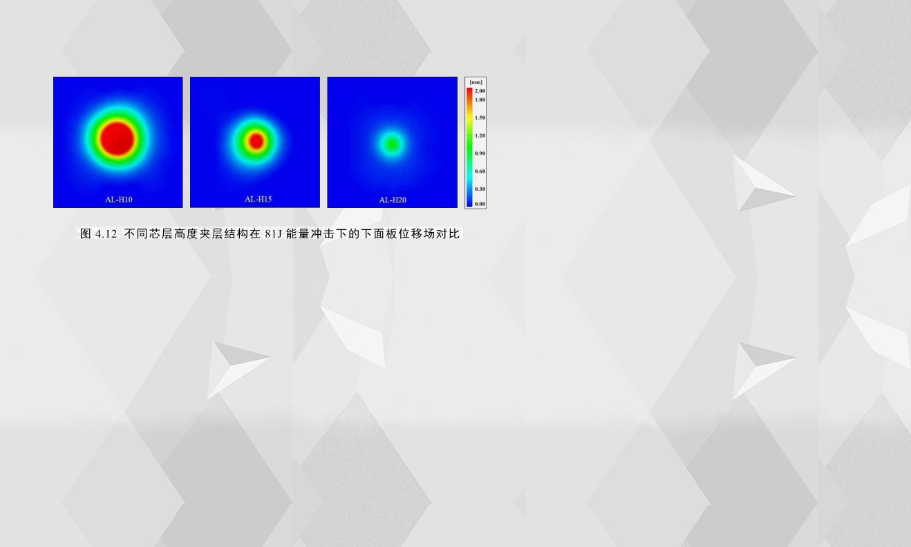 4.12比較了三種芯層高度的夾層結構在81J能量沖擊下的下面板位移場,可以發現,位移場以沖擊點為中心呈環形分布,且隨著芯層厚度的增加,下面板的最大位移量減小,并且變形面積逐漸減少。