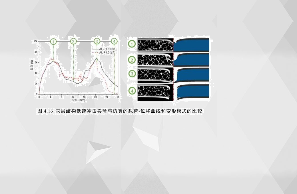 圖4.16比較了AL-F1.5試驗和仿真在完全穿透沖擊能量下的載荷-位移曲線以及不同沖擊能量下的變形過程??梢钥闯?,無論是抗沖擊響應還是結構變形模式,試驗和仿真都吻合得較好。由于仿真加載過程中網格單元的失效以及刪除使得其載荷-位移曲線存在一些波動,而其初始峰值載荷和穿透吸能的誤差范圍保持在5%和10%以內。