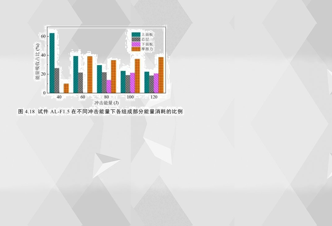 4.18AL-F1.5在不同沖擊能量下各組成部分能量吸收的比例。上面板消耗的能量比例在小能量(40J)沖擊下最大(高達64%)芯層耗能占比為26.5%因此在小能量沖擊下,增強上面板和芯層的防護更能提高結構的耐沖擊性能;當下面板完全穿透時,摩擦力消耗的能量占比最高(約為38%)有趣的是,在各沖擊能量下,泡沫芯層吸能占比均在20%左右;此外還發現,無論夾層結構穿透與否,上面板的耗能占比均大于下面板,這說明增強上面板更能提高夾層結構的耐沖擊性。